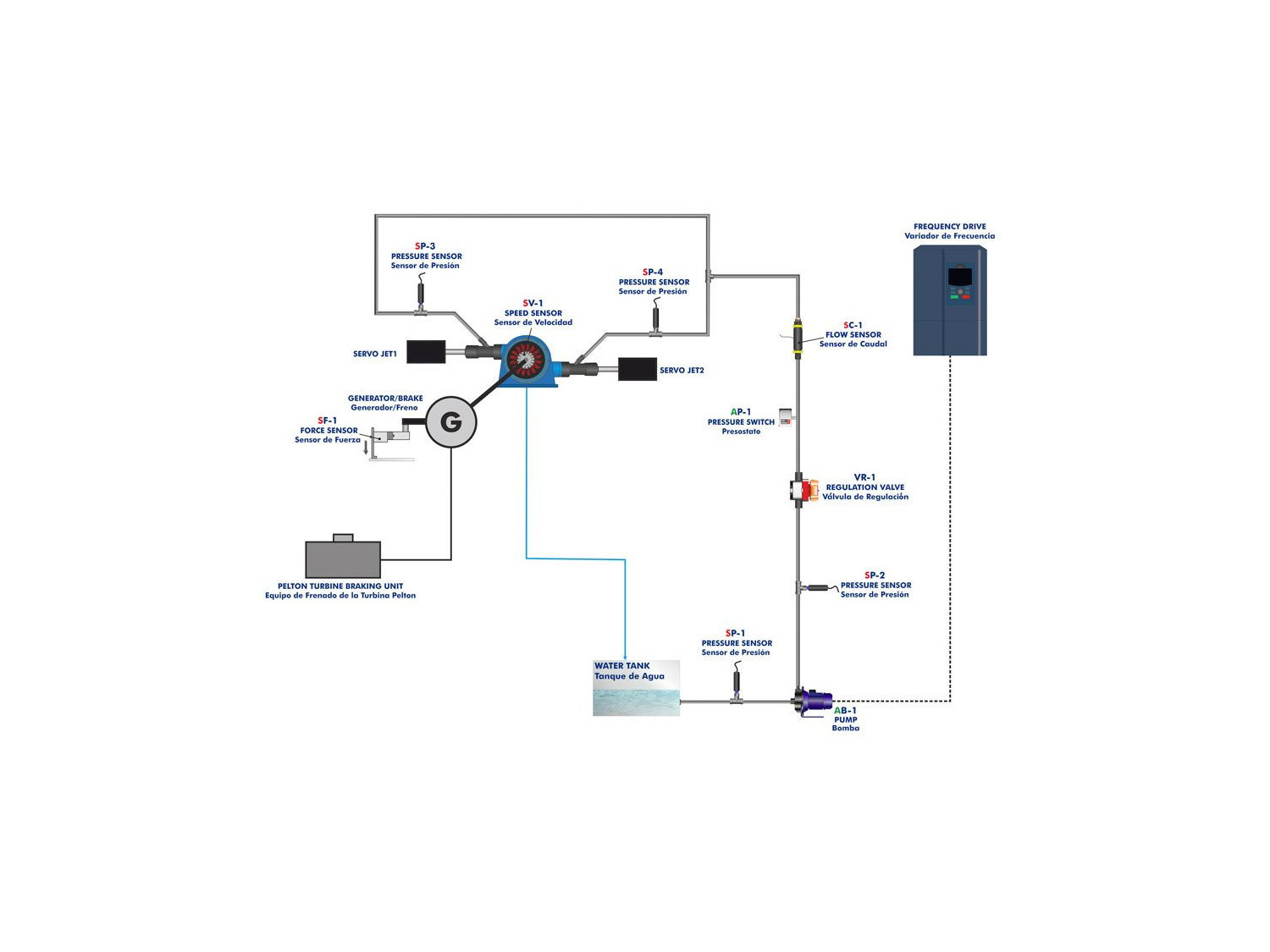 From the mechanical point of view, this unit is built with an aluminum and steel structure that integrates the following components: a 1 kW Pelton turbine with two servo-driven injectors, a water tank to simulate the reservoir, a water pump that allows simulating a waterfall of up to 80 meters, 2-inch PVC pipes for channeling the water from the pump to the injectors, and two servomotors that control the opening and closing of the injectors. These injectors can be controlled manually from the SCADA system or automatically by means of an advanced controller, which is described later in this catalog. In addition, the "HPPP" part number incorporates strategically placed sensors to measure and analyze physical variables of the system, such as flow, pressure such as flow, pressure, speed and torque. These sensors allow the user to visualize and analyze the partial and total efficiencies of the turbine and plant, the torque exerted by the turbine as a function of the injector opening, the mechanical power developed, the water flow required the water flow required to generate this power, the optimization of the turbine performance according to the ideal water head, and the impact of the turbine’s and the impact of the asymmetry of the pressures of the two injectors on the turbine performance, among other aspects.