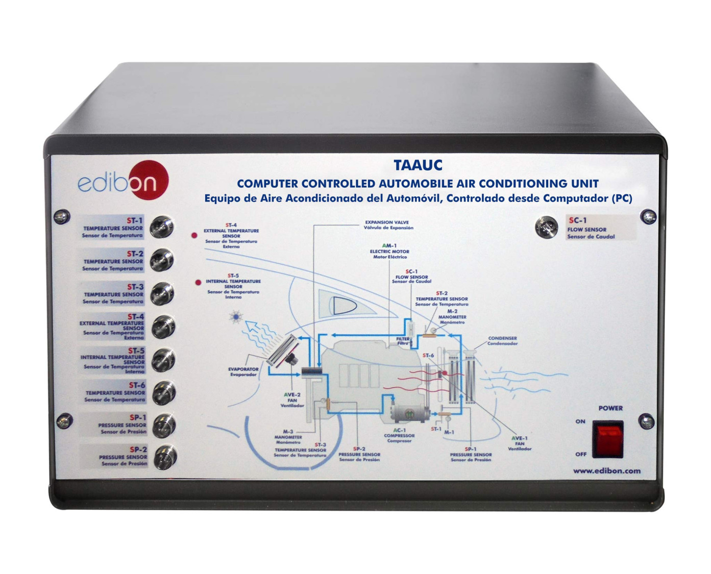The Computer Controlled Automobile Air Conditioning Unit, "TAAUC", designed by EDIBON, consists, basically, of a compressor driven through a belt by a motor that simulates the engine of a car.