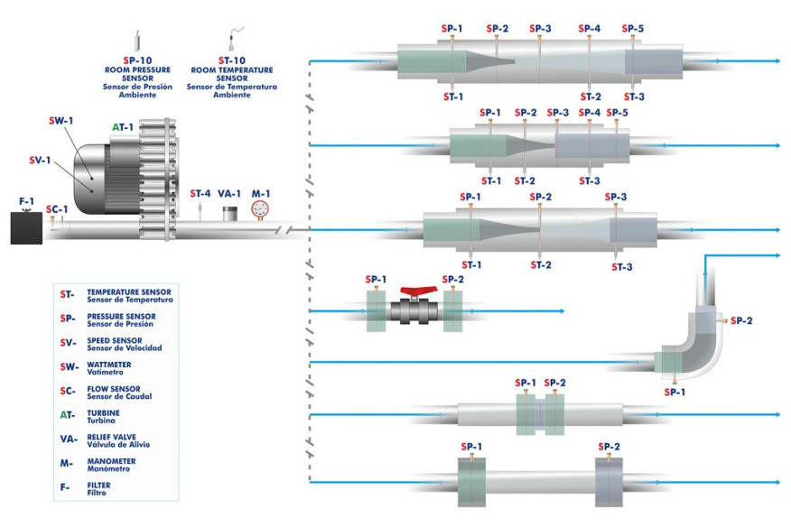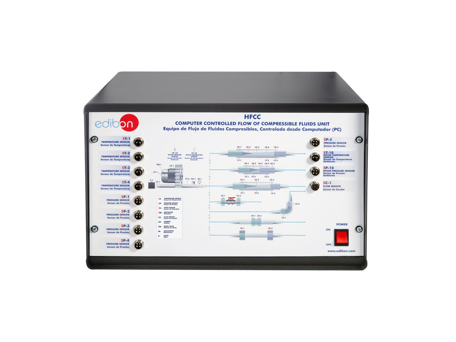 The Computer Controlled Flow of Compressible Fluids Unit, "HFCC", allows to study the variation of pressure and density, the speeds of the fluid, the different fluctuations that the fluid presents when fluids across different sections in a pipe, and the thermodynamics and fluid dynamics characteristics that the fluid has.
