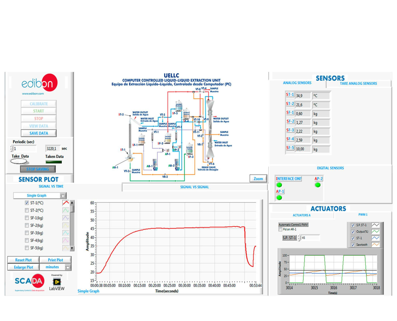All storage tanks have force sensors to measure the mass in the five tanks (feed, refined, solvent, extract and solute) and to calculate the liquid volume.