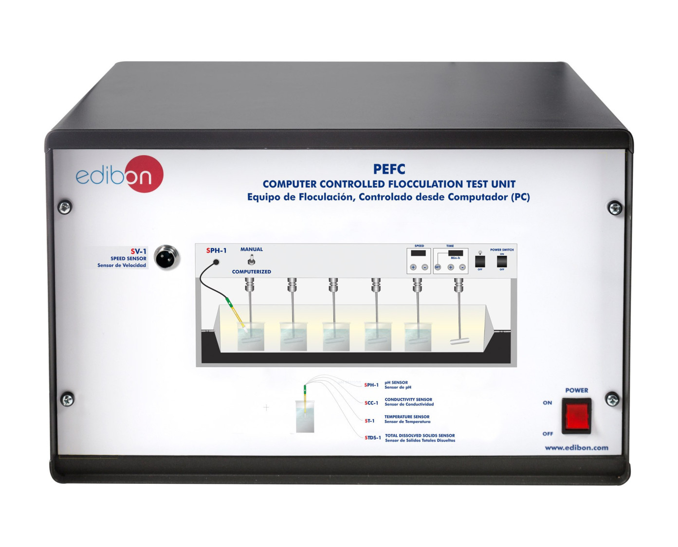The Computer Controlled Flocculation Test Unit, "PEFC", designed by EDIBON, allows to study the coagulation and flocculation operations and to analyze the main parameters that determine the colloids removal operation.