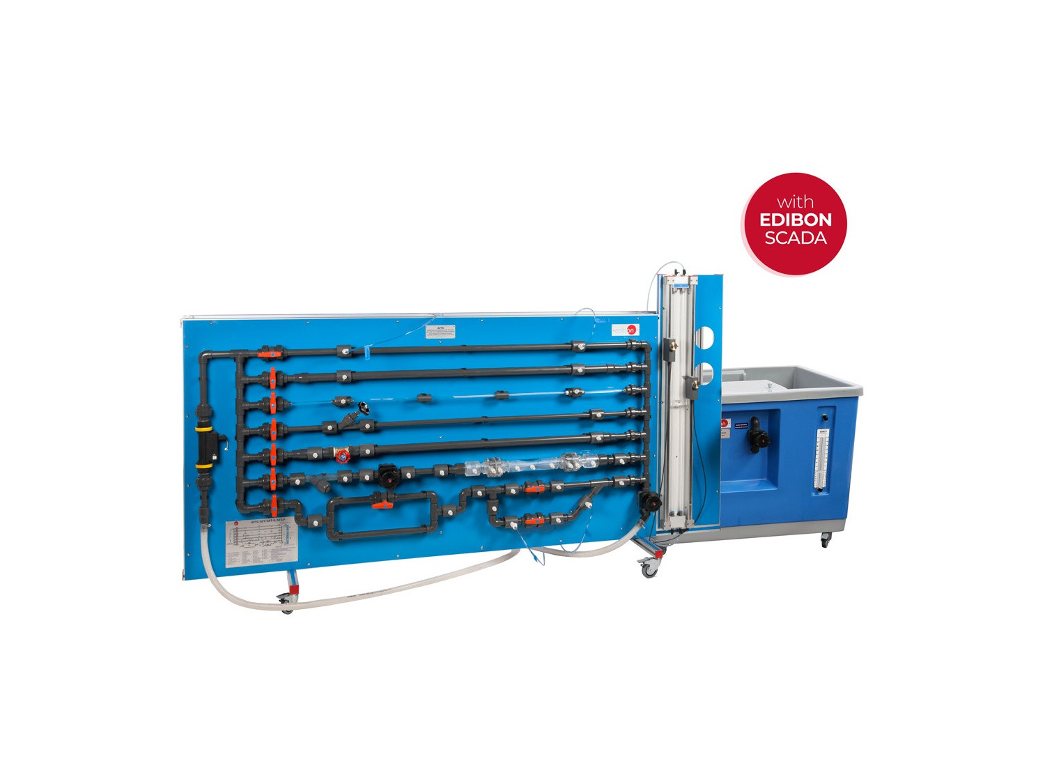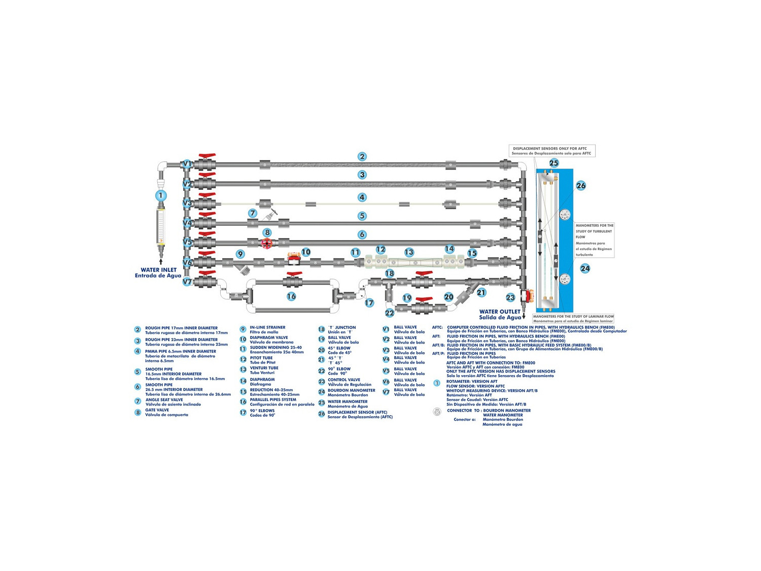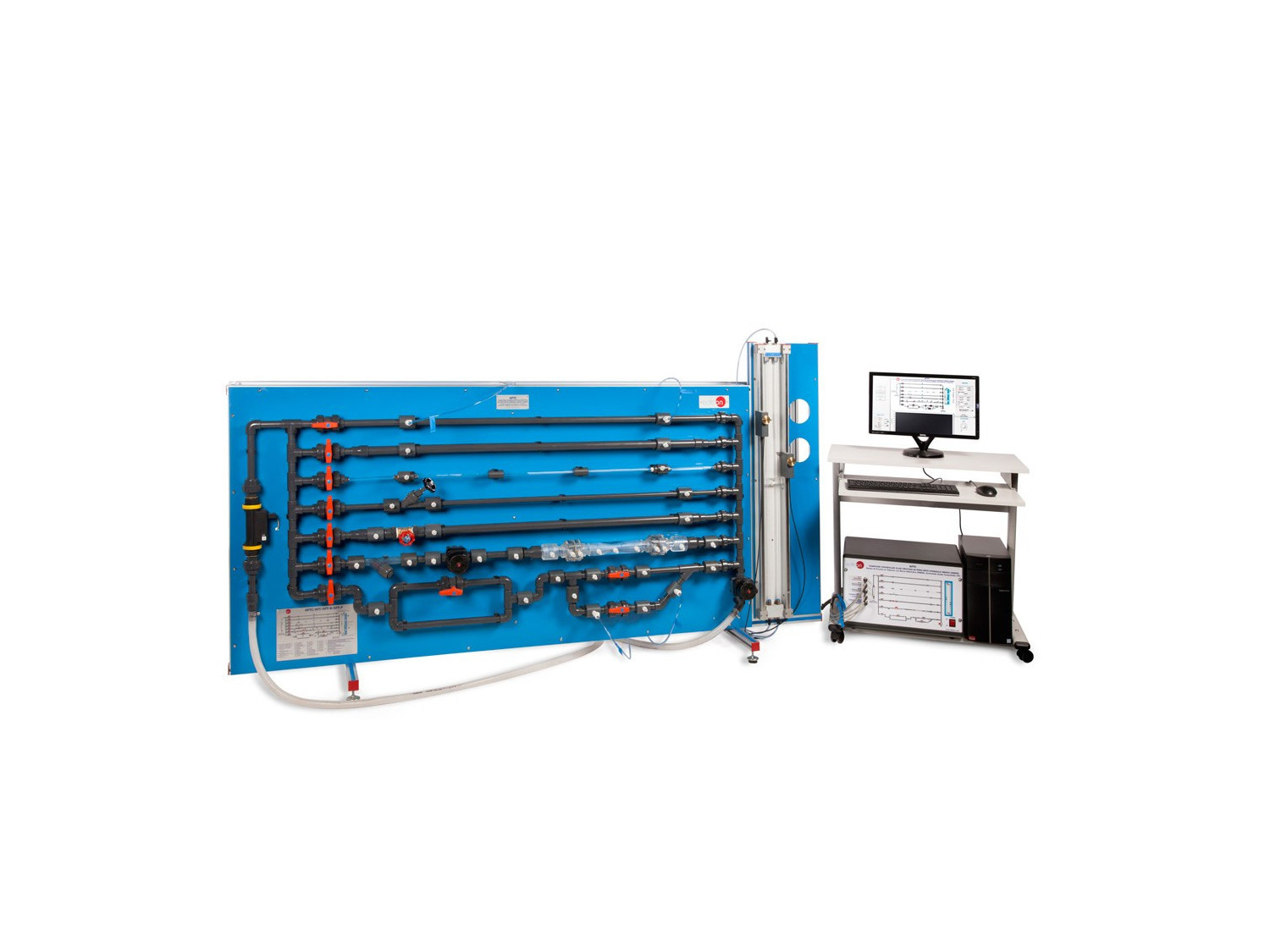 The Computer Controlled Fluid Friction in Pipes, with Hydraulics Bench (FME00), "AFTC", is designed to determine the friction coefficient in pipes of several diameters and roughness, to study the pressure losses and pressure development in different types of valves and fittings and to compare different methods to measure the flow.
