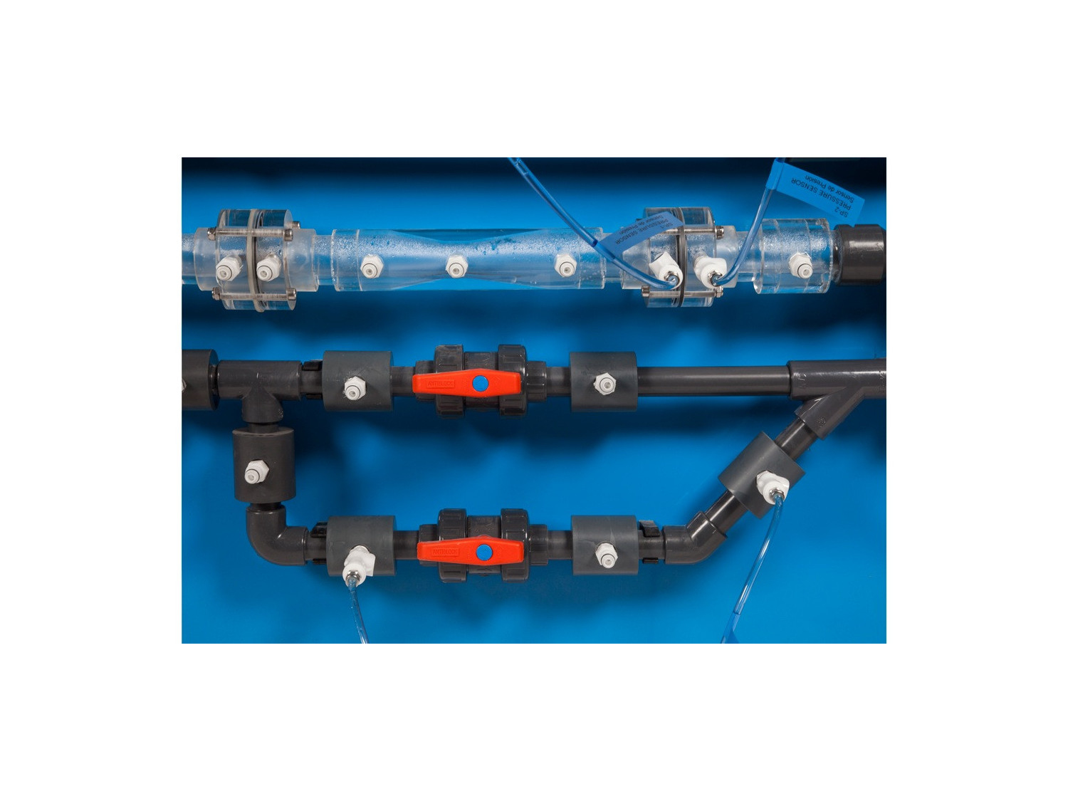 Additionally, a wide range of accessories are included for the study of losses in straight pipes, several types of valves (gate, ball, angle seat, etc.), pipe fittings (mesh filter, elbows, sudden widening, contraction, etc.) and measuring elements (Venturi tube, Pitot tube, orifice plate flowmeter, flow measuring nozzles, etc.).