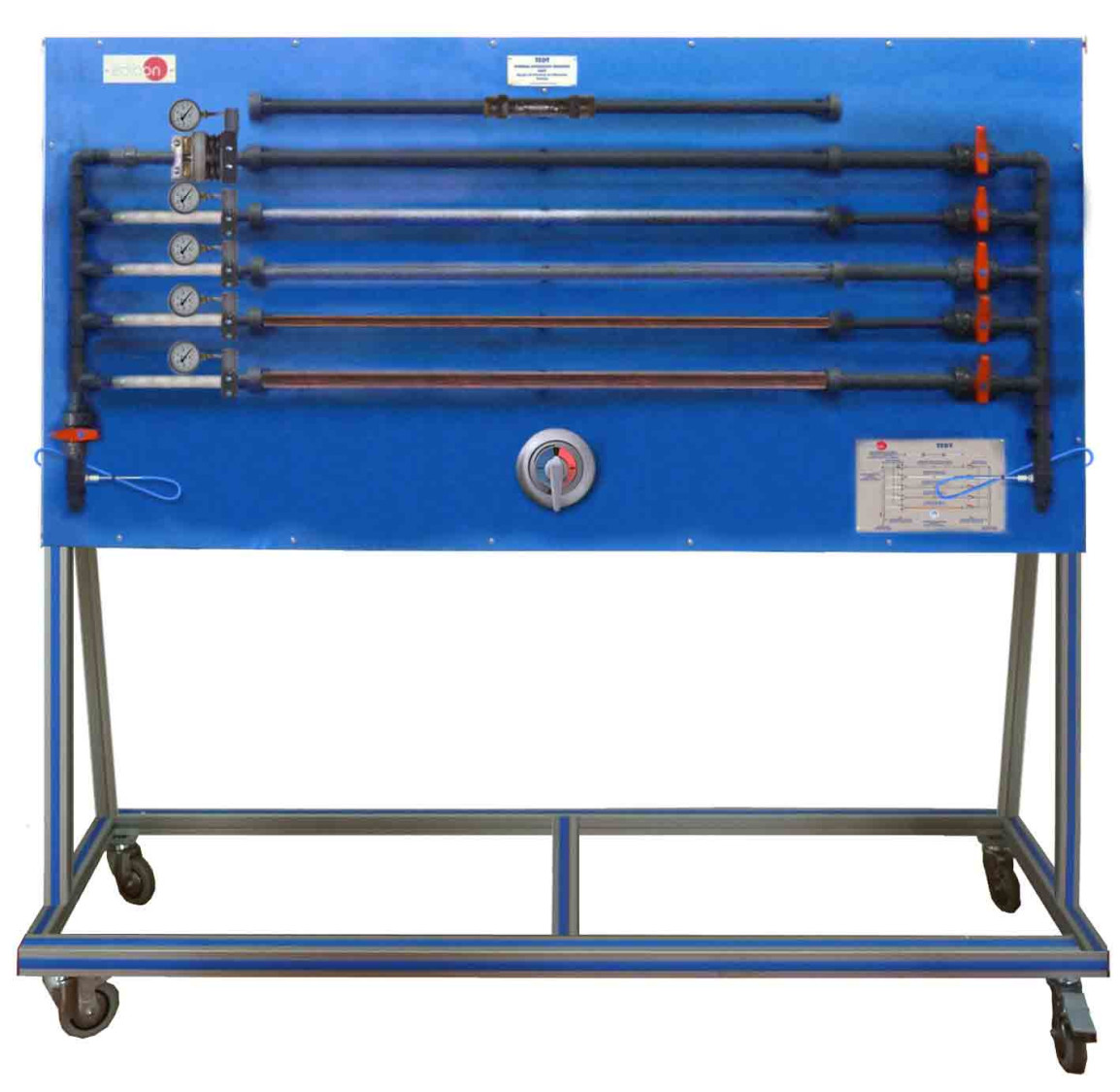 This unit provides measurements for the determination of the thermal expansion of several pipe sections. The unit includes six pipe sections and one of these sections is fitted with an expansion compensator to compensate thermal stress in the pipe. These sections are made of different materials and diameters. Several dial gauges situated on the pipe sections inlet measure the elongation of the pipes and a force measuring device allows to determine the thermal expansion force. The pipe sections can be individually selected using the ball valves situated at the pipe section outlet. The cold and hot water connections made using quick-release couplings. The water inlet temperature can be adjusted by these connections and a mixing faucet. The inlet and outlet lines include two temperature sensors to measure the change of temperature.
