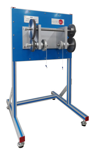 The unit is mounted on a metal structure with bearings that support the gear drive shafts. Four gears with different numbers of teeth are available, allowing the simulation of a single gear, a single gear system and a double gear system.