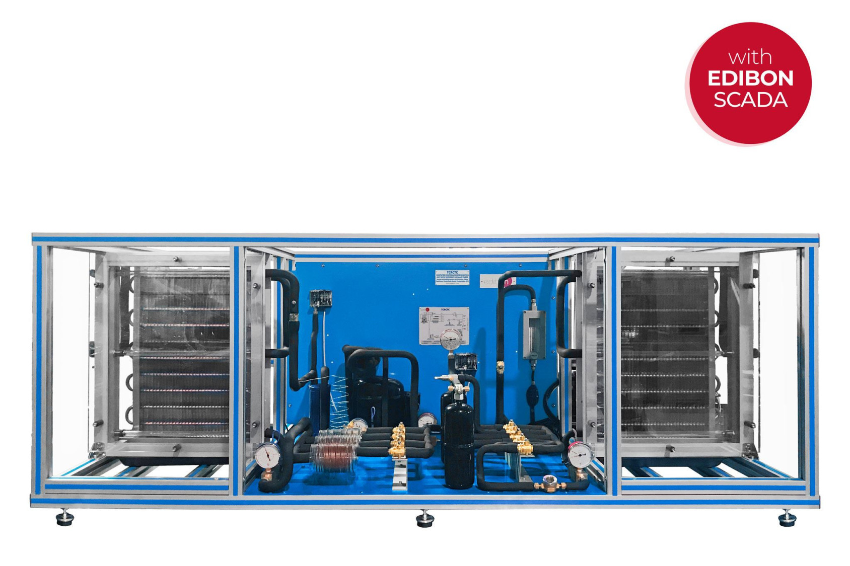 The Computer Controlled Refrigeration Unit with Different Capillary Tubes, "TCRCTC", designed by EDIBON, is clearly arranged and represents a typical compression refrigeration system with compressor.