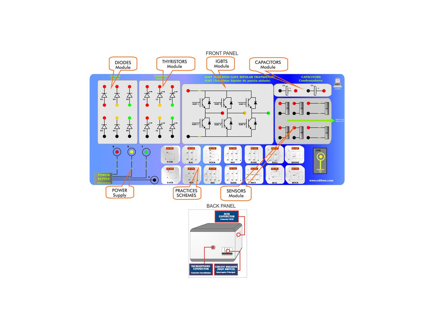 The Computer Controlled Teaching Unit for the Study of Power Electronics (with IGBTS). (Converters: AC/AC+AC/DC+DC/DC+AC/ AC), "TECNEL", designed by EDIBON, is a unit with Computer Control and Data Acquisition System designed to study the basis of Power Electronics. It allows students to study AC/DC, DC/AC, DC/DC, AC/AC converters.