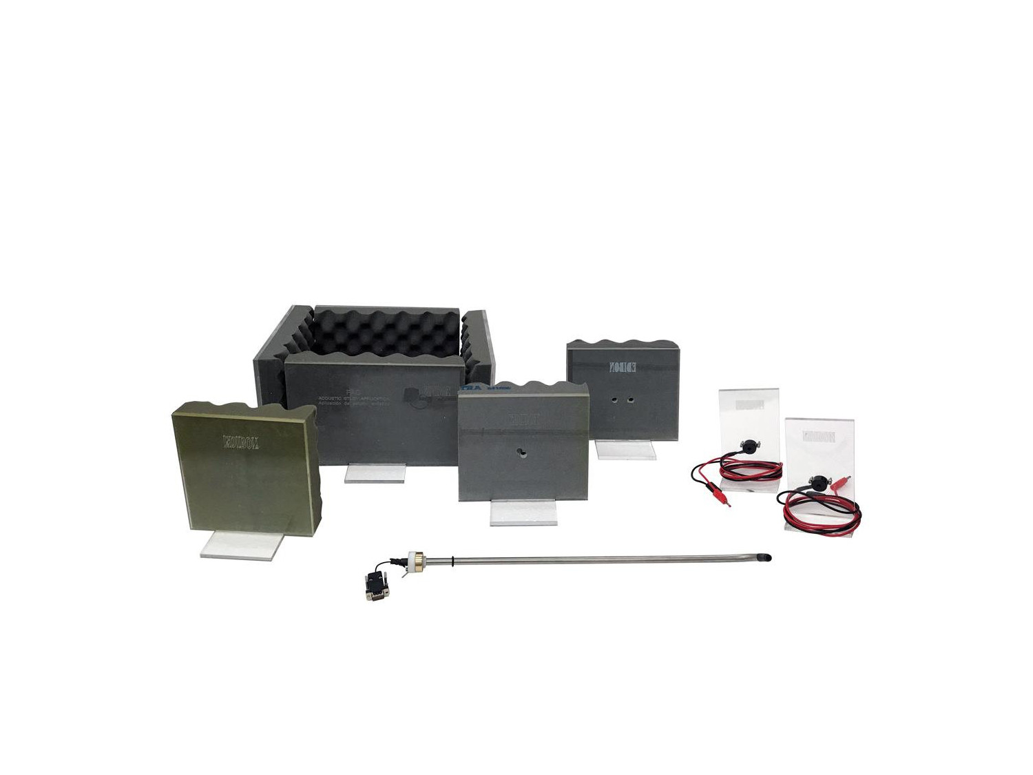 The Set "FAC" is based on the reproducibility of a physical process. For this purpose, the computer-controlled robot arm sweeps a region of space measuring the intensity of the acoustic wave at equidistant points. The perfect synchronization between the transmitter and receiver, together with the control and management software, allows the student to visualize the propagation of the sound wave in space. The use of the control system with more than one emitter allows us to study the processes of constructive and destructive interference. The set is supplied with a set of acoustic materials (mirrors, lenses and diffraction gratings) that allow the study of reflection, refraction and dispersion processes, as well as acoustic shielding processes.