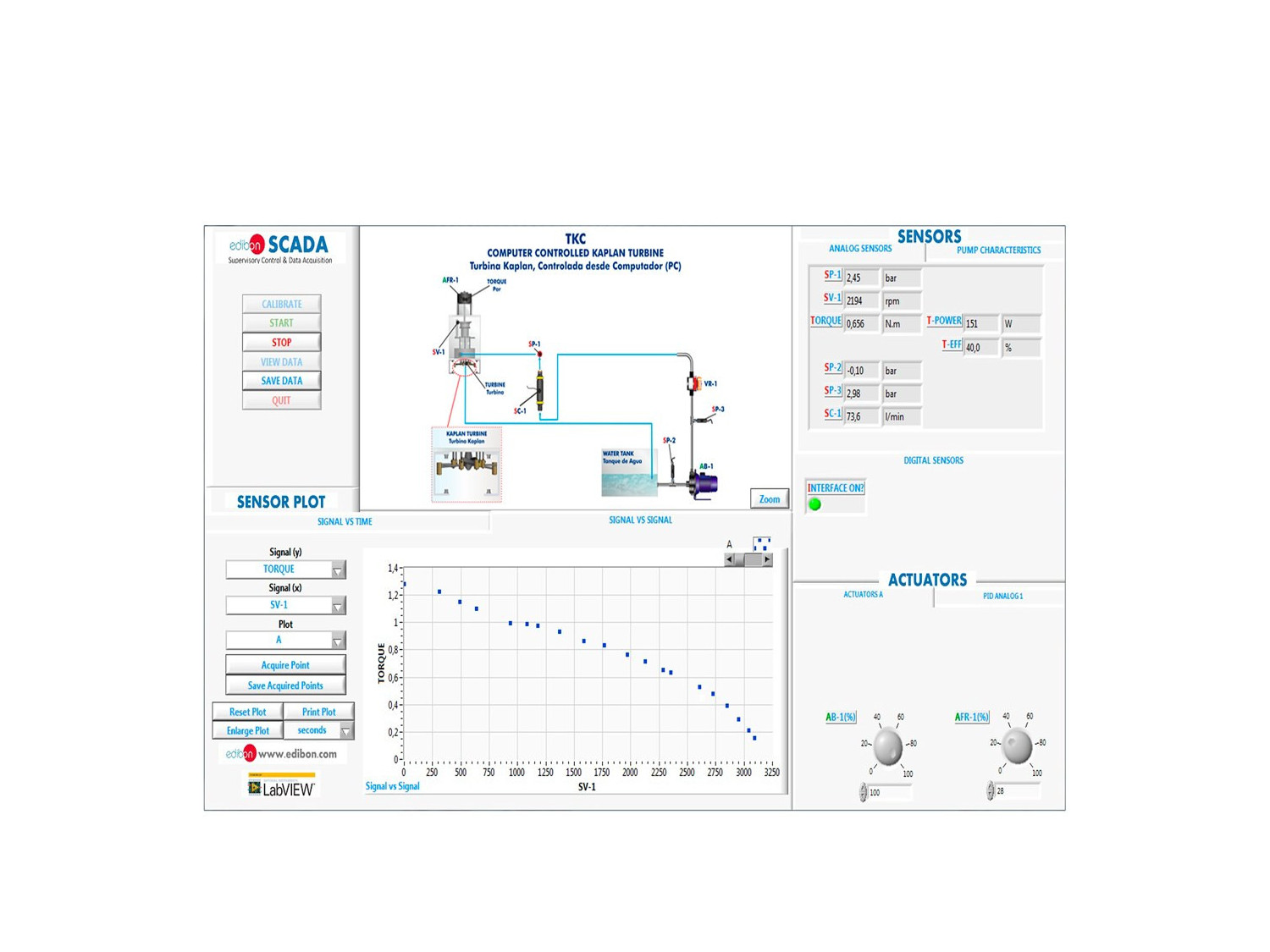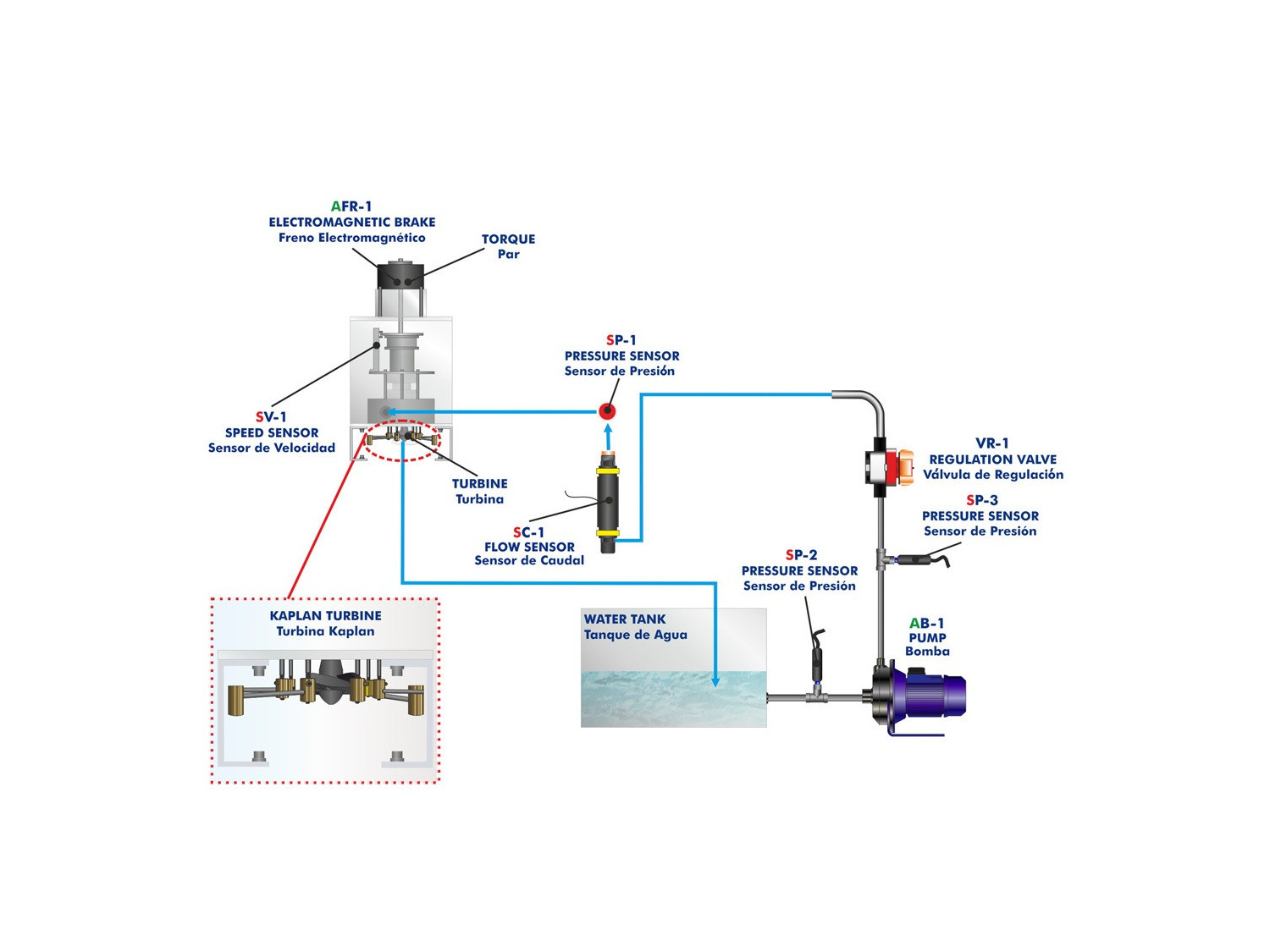In addition, the unit is equipped with a pressure sensor placed at the turbine water inlet which measures the inlet pressure, a flow sensor to measure the turbine water inlet flow, an optical sensor which determines the speed of the turbine shaft, and has two pressure sensors at the pump inlet and outlet, in order to obtain its characteristic curve.