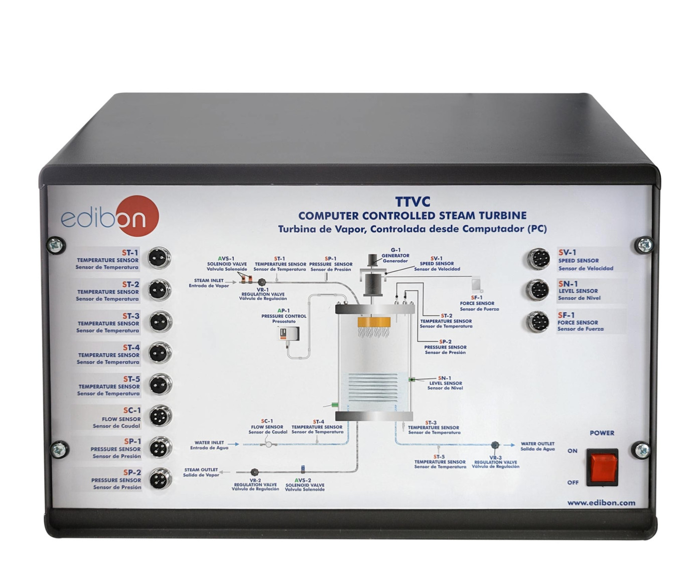 The Computer Controlled Steam Turbine, "TTVC", designed by EDIBON, consists of a single stage impulse steam turbine. It includes an injector, a brake, a water cooled condenser, safety mechanisms and all the necessary controls and instrumentation.