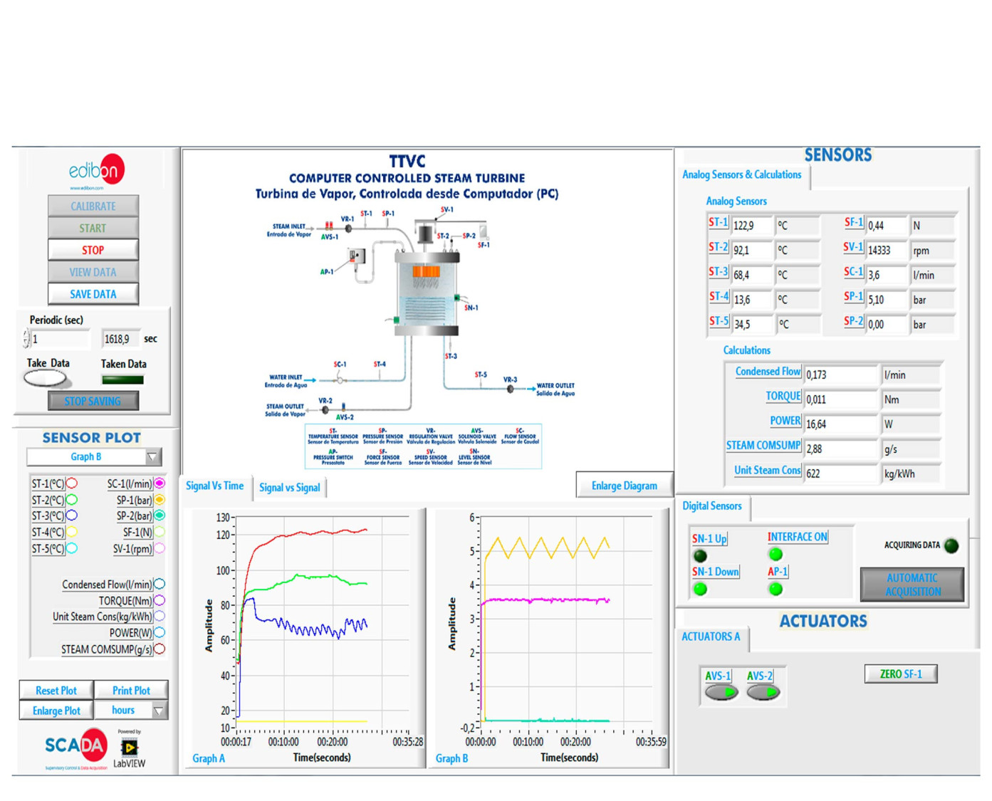 Pressures, temperatures, refrigeration water flow and speed of the turbine shaft are measured using sensors, the force of the brake is measured by a force sensor (load cell) and the steam flow.