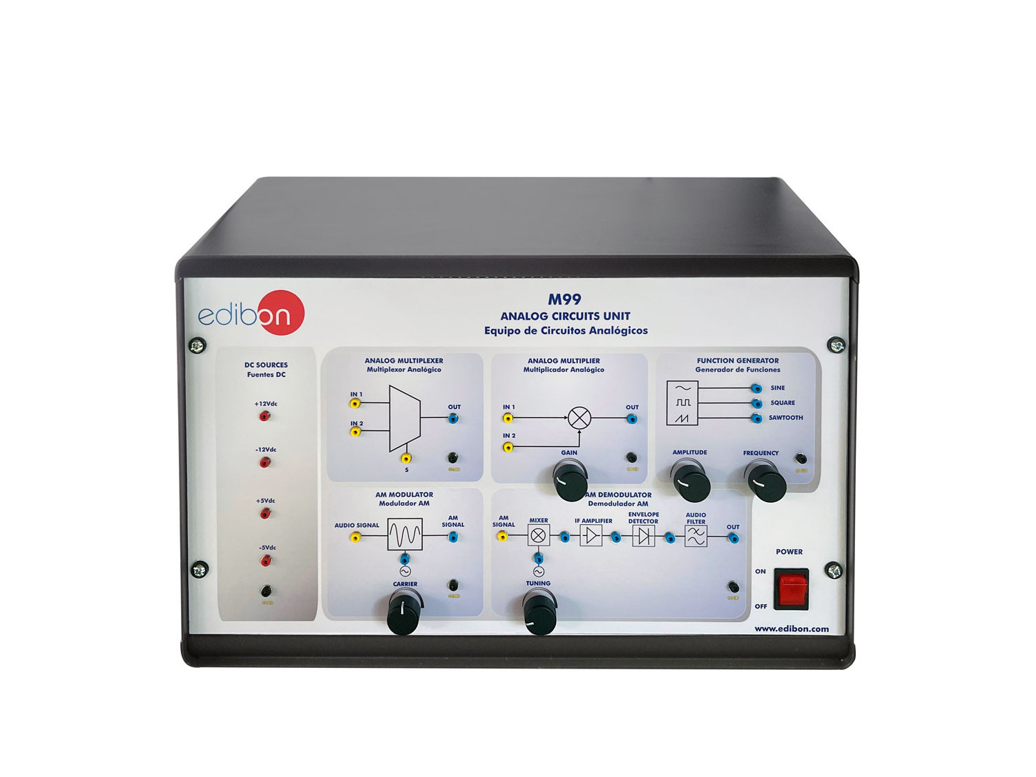 The Analog Circuits Unit, "M99", designed by EDIBON, allows to do different practices related to basic electronics. The unit has different parts: analog multiplexer, analog multiplier, function generator, AM modulator and AM demodulator.