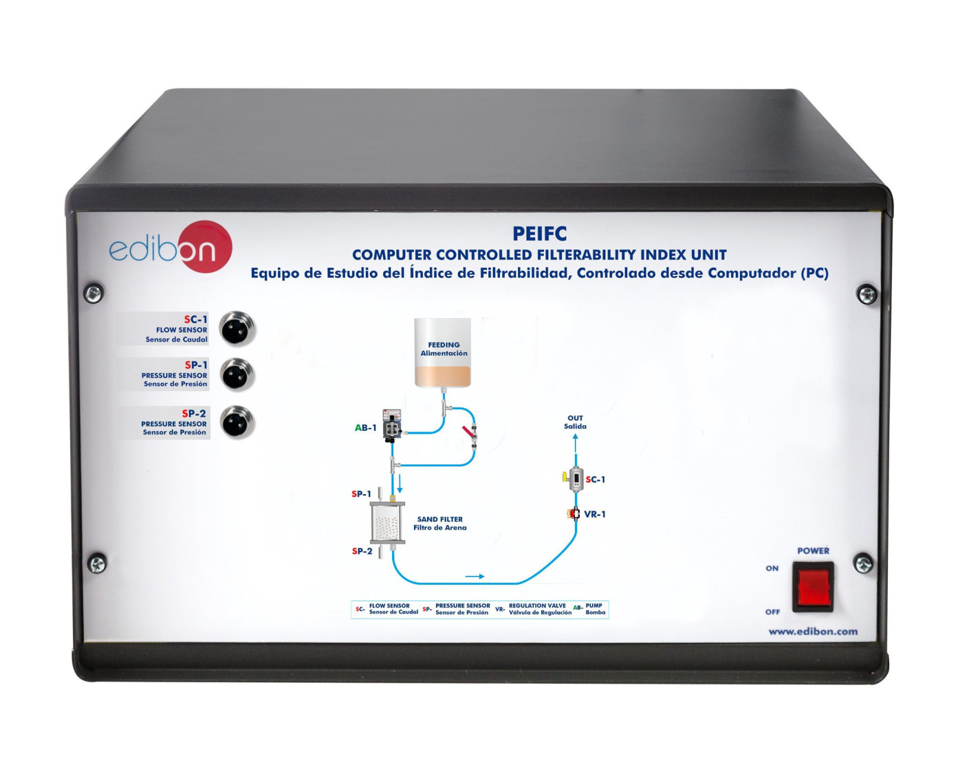 The Computer Controlled Filterability Index Unit, "PEIFC", designed by EDIBON, is a unit for demonstrating the filtering process through a porous media. It enables a water quality test to be made on a suspension to be filtered through sand or similar granular media.