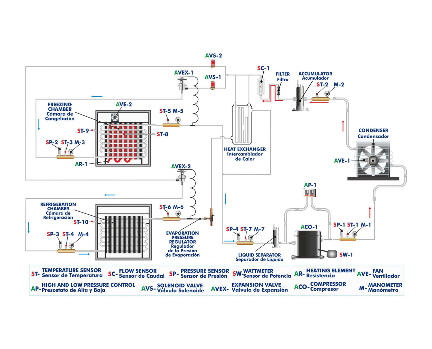 The Computer Controlled Refrigeration Unit with Refrigeration and Freezing Chamber, "TRRC", has been designed by EDIBON to study a refrigeration system with two different chambers at different temperature.