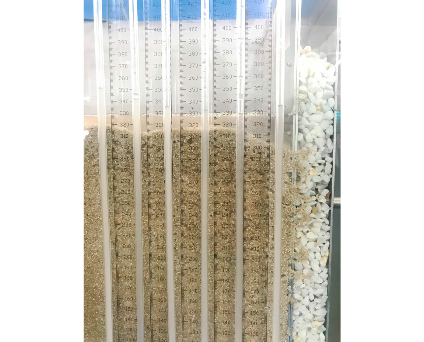 The main element is a tank with one working section and two side chambers, one for water inlet and one for water outlet. The sand bed through which the groundwater flows is located in this tank. Its flow can be adjusted by means of height-adjustable overflows. In addition, manometric tubes have been inserted throughout the section to allow us to visualize the fluid dynamic behavior of the simulated soil.