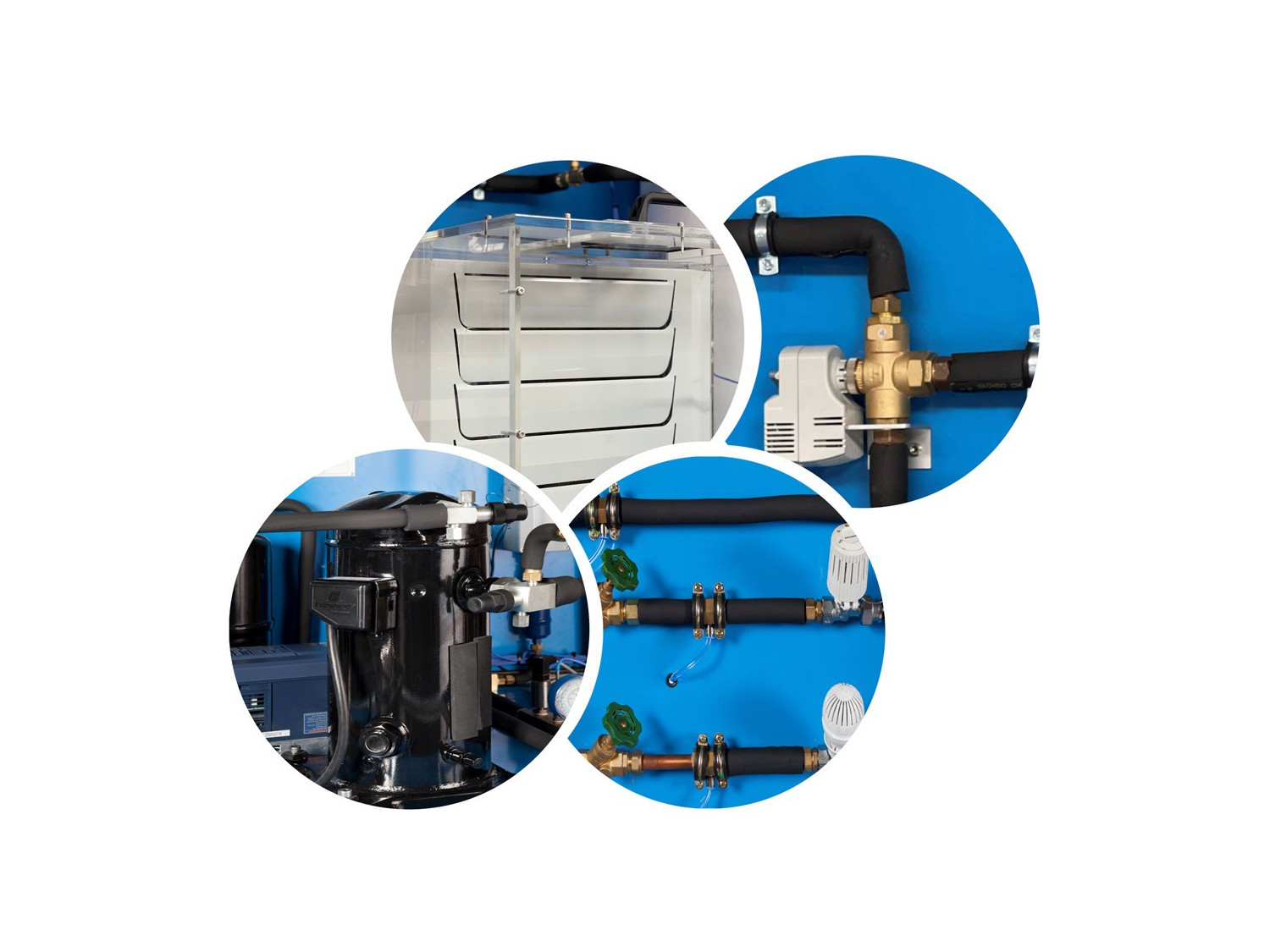 Both the evaporator and condenser can be connected to different heat sources and heat exchangers to analyze and study the advantages and disadvantages of different systems.