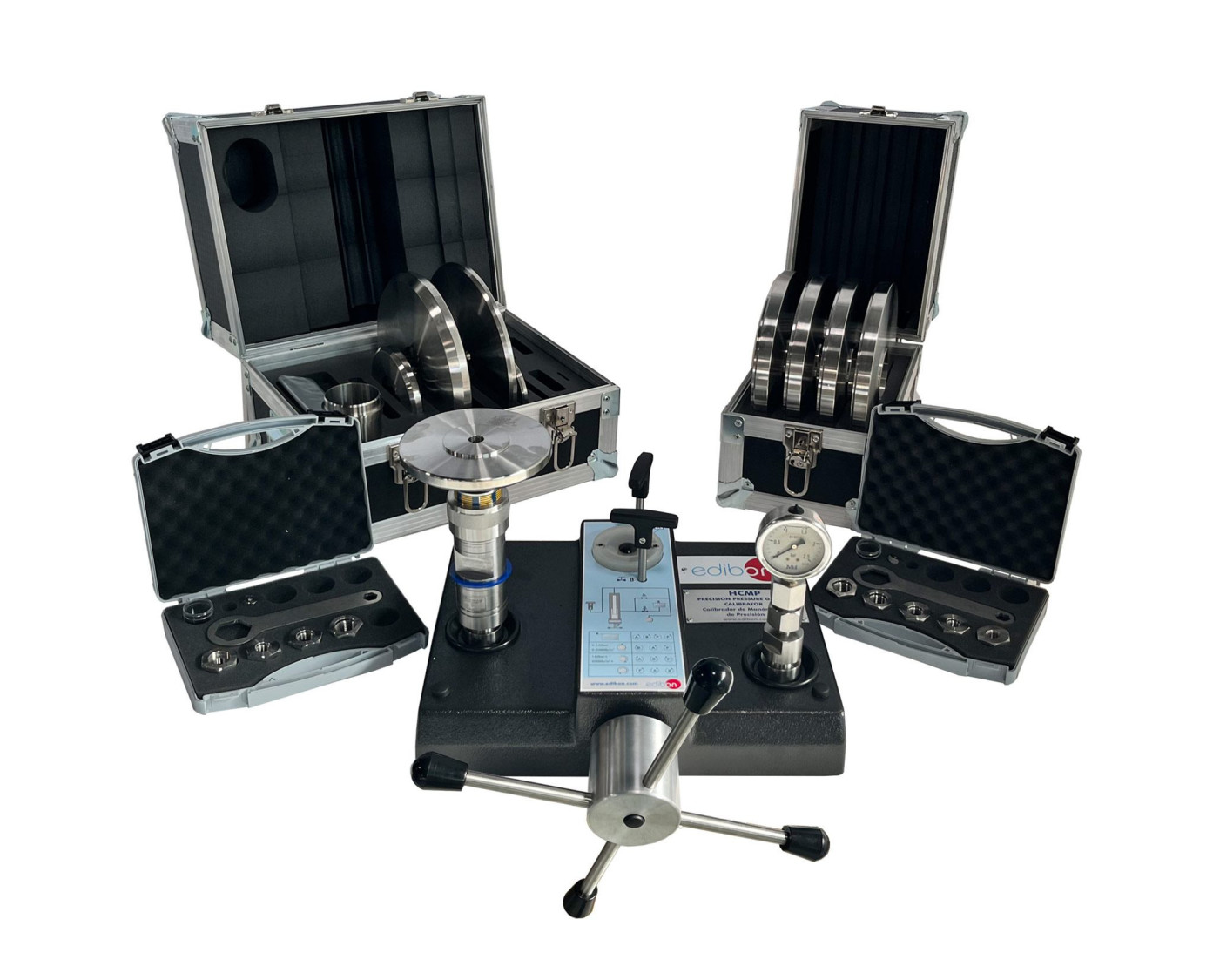 The Precision Pressure Gauge Calibrator, "HCMP", designed by EDIBON, is a self-contained and portable dead weight precision pressure gauge calibrator that allows pressure gauges to be accurately calibrated up to 300 bar.