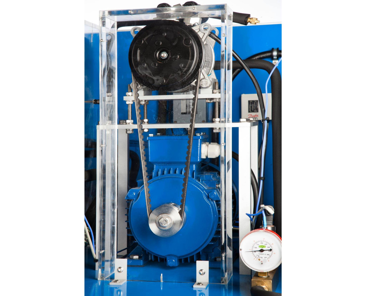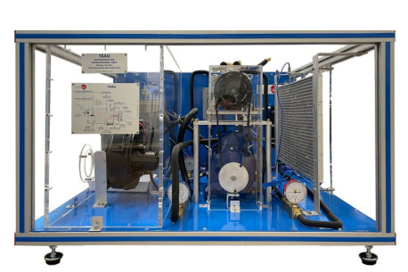 The Computer Controlled Automobile Air Conditioning Unit, "TAAUC", designed by EDIBON, consists, basically, of a compressor driven through a belt by a motor that simulates the engine of a car.