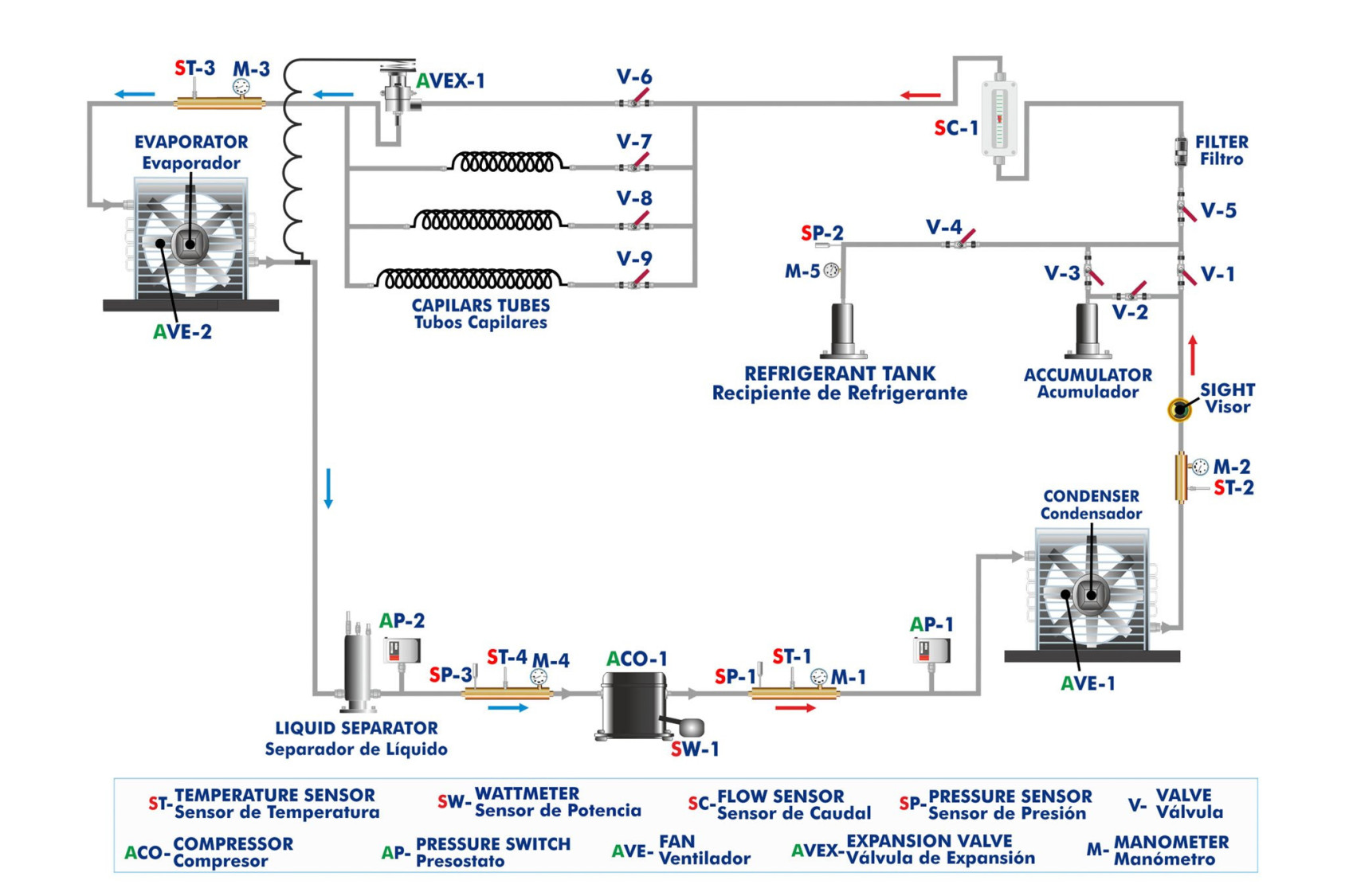 The unit includes three capillary tubes of different lengths and a thermostatic expansion valve for the comparison of serveral expansion elements.