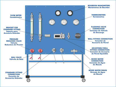 This unit provides measurements for the determination of the thermal expansion of several pipe sections. The unit includes six pipe sections and one of these sections is fitted with an expansion compensator to compensate thermal stress in the pipe. These sections are made of different materials and diameters. Several dial gauges situated on the pipe sections inlet measure the elongation of the pipes and a force measuring device allows to determine the thermal expansion force. The pipe sections can be individually selected using the ball valves situated at the pipe section outlet. The cold and hot water connections made using quick-release couplings. The water inlet temperature can be adjusted by these connections and a mixing faucet. The inlet and outlet lines include two temperature sensors to measure the change of temperature.