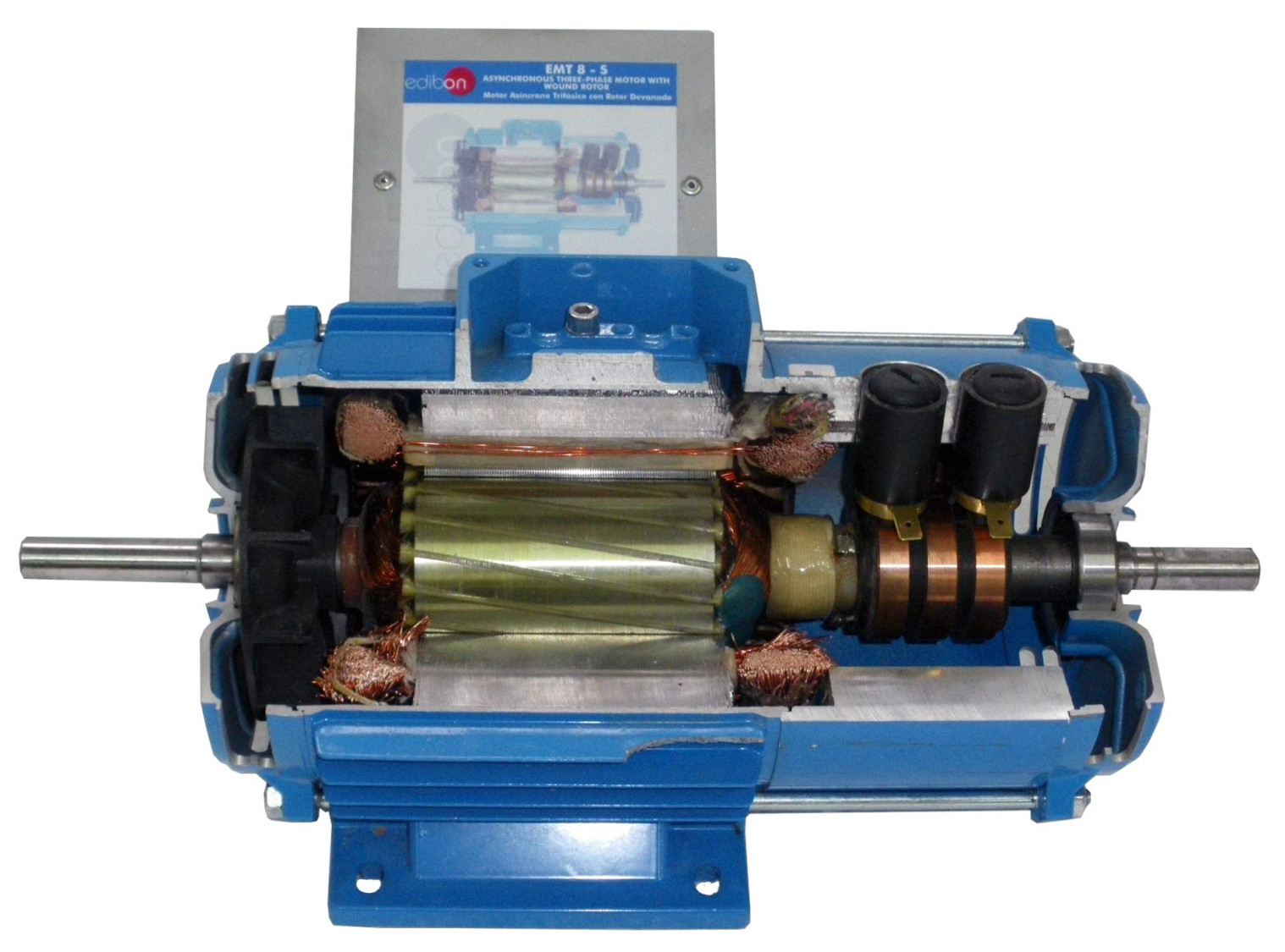 It includes a Cut away asynchronous three-phase motor with wound rotor (EMT8-S) in order to study the different parts of this motor type.