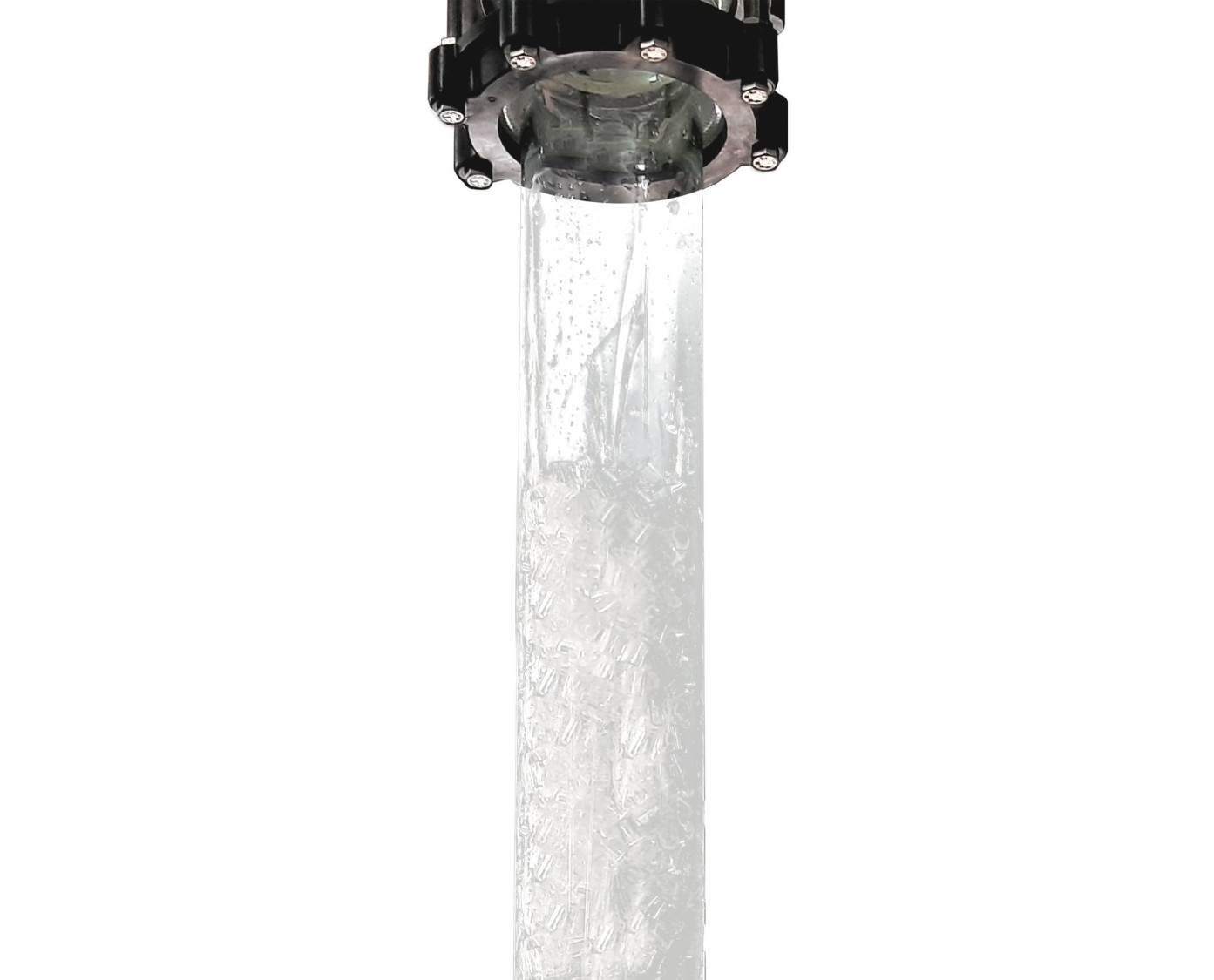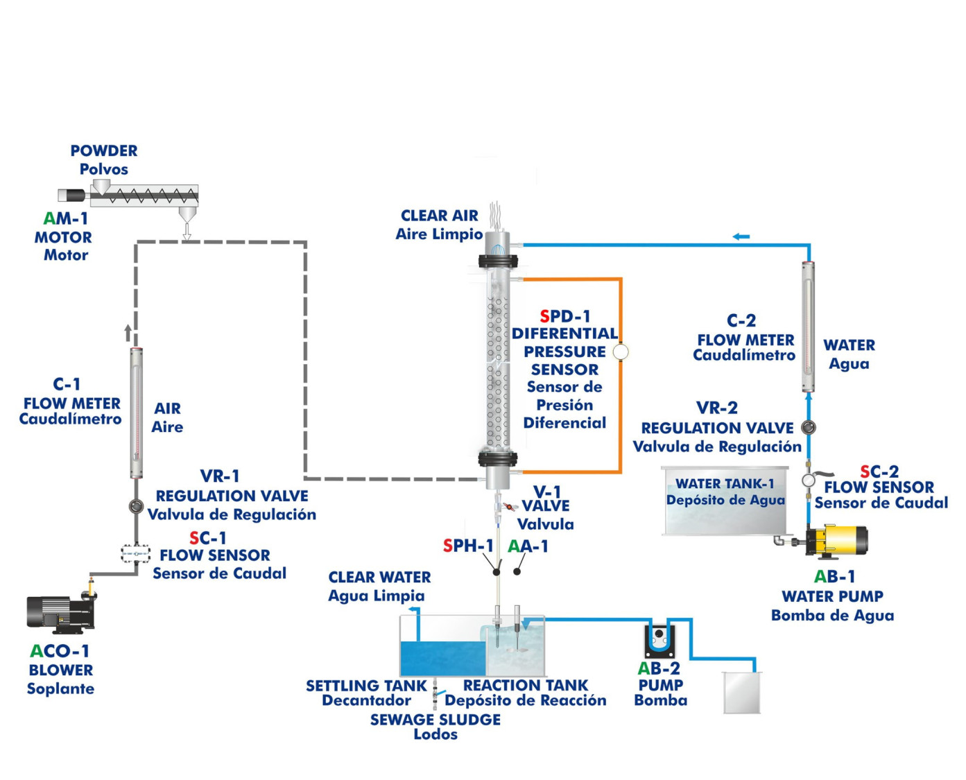 The Computer Controlled Gas Washing Processing Plant, "PLGC", designed by EDIBON, has a water feed tank, from which and by means of a water pump, the water is pumped to the upper part of a column. The solids are added by means of a solid dosing system to the air current, which is introduced in the column by its lower part. The water pumped to the upper part of the column is pulverized, by means of showers, to drag the added solids in the air current.