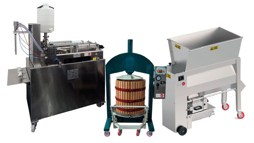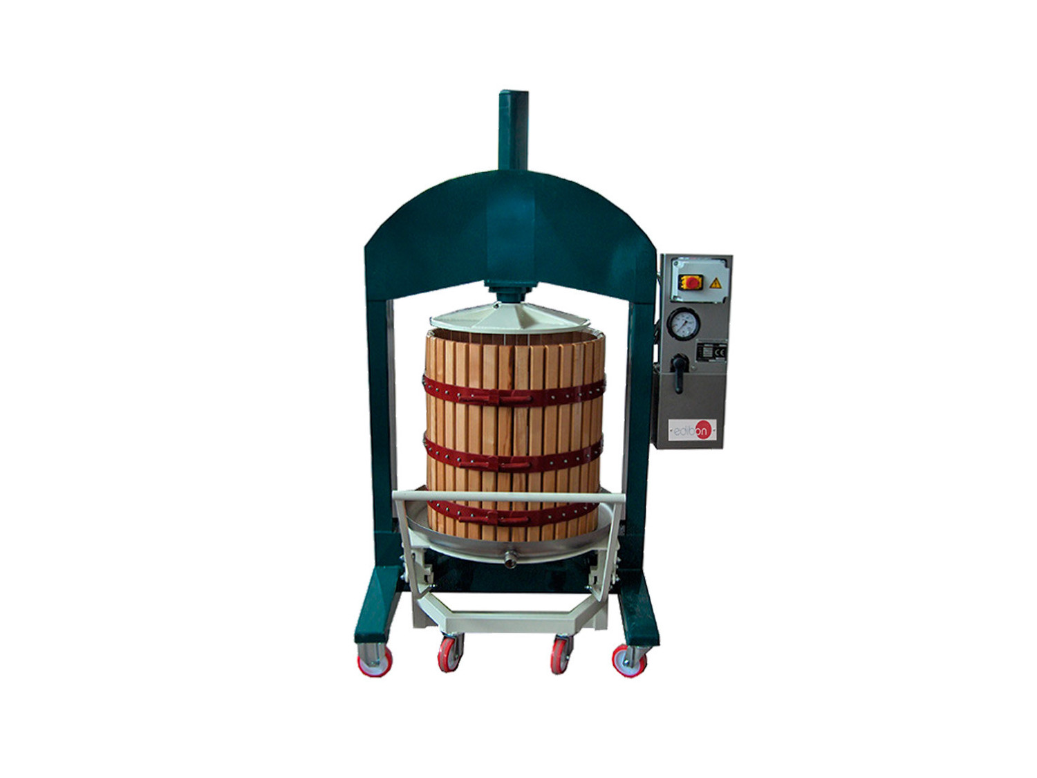 - HGP/CTS. Prensa Hidráulica de Uvas, Controlada por Computador (PC) e Tela Sensível ao Toque: Posteriormente, o produto proveniente da desengaçadeira é introduzido em uma prensa, na qual um líquido filtrado é obtido. O uso de uma prensa aumenta a produtividade do processo ao permitir a obtenção de uma quantidade maior de líquido que não fica retido na casca.