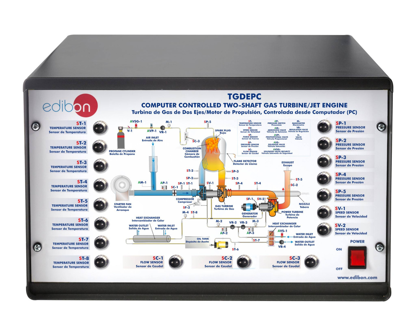 The Computer Controlled Two-Shaft Gas Turbine/Jet Engine, "TGDEPC", designed by EDBION, is a teaching unit for the operation demonstration of a Double Shaft Gas Turbine for electric generation and for other uses too.