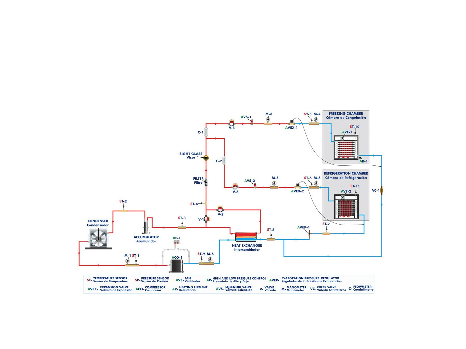 In this unit, the components of a refrigeration circuit are clearly laid out, including refrigeration and freezing chambers. In these circuits, both temperature and humidity can be measured for improved system control.