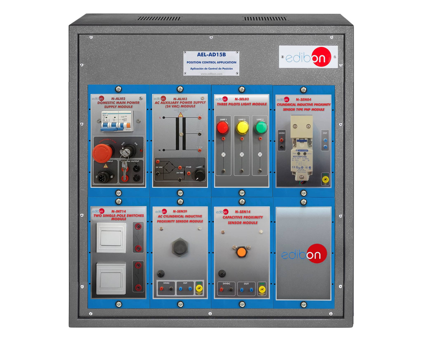 The Position Control Application, "AEL-AD15B", has been designed by EDIBON to study different types of position sensors and their possible applications. For that propose, this application includes the following sensors: a PNP type inductive sensor, which works with DC and detects metals in a specific distance range, a capacity proximity sensor, to detect both metals and no metals and other inductive sensor, which works with AC and detects any metal.