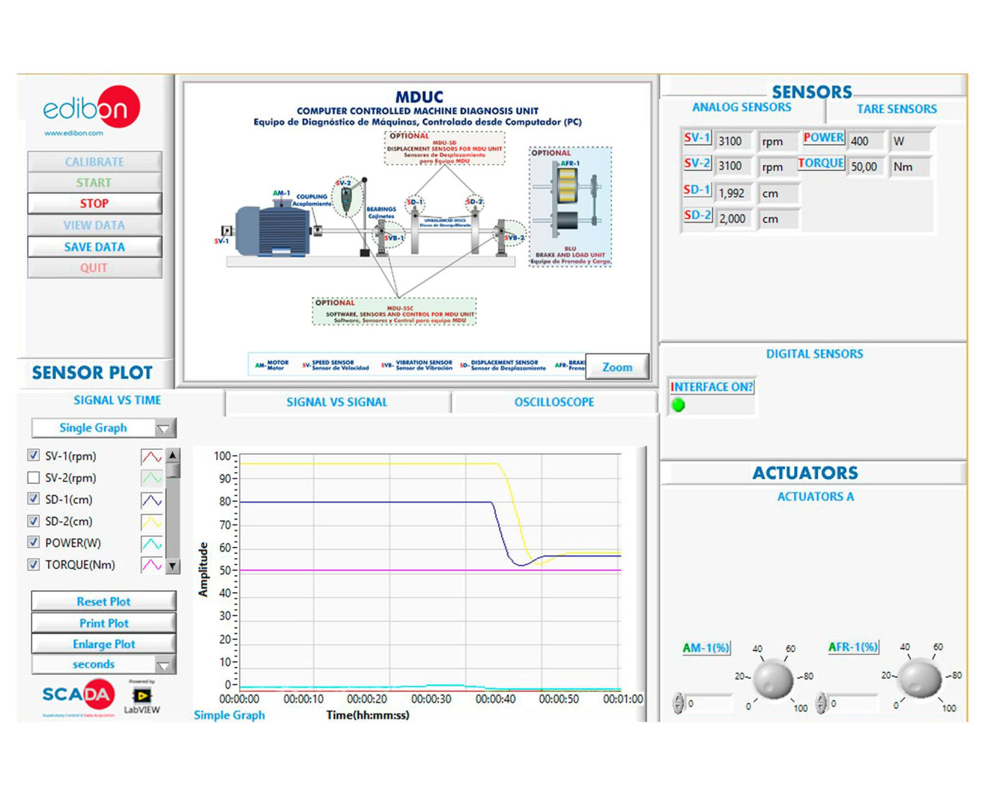The Computer Controlled Machine Diagnosis Unit, "MDUC", of EDIBON, allows you to perform vibration measurement practical exercises, measuring the displacement, velocity and acceleration of vibrations in the time-frequency range.