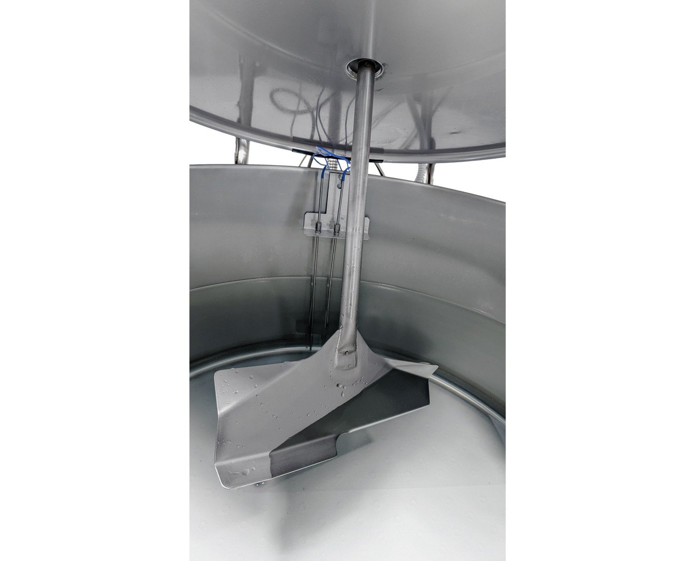 - Lid and agitation: The open vertical tank is fitted with a lid on its upper part constructed of AISI 304 stainless steel with an AISI 304 stainless steel compensated hinge opening system. In its upper part and off-centre, there is a reduction motor with its corresponding stainless steel paddle which, rotating at 30 r.p.m., allows perfect homogenisation of the fat content of the milk in less than two minutes.