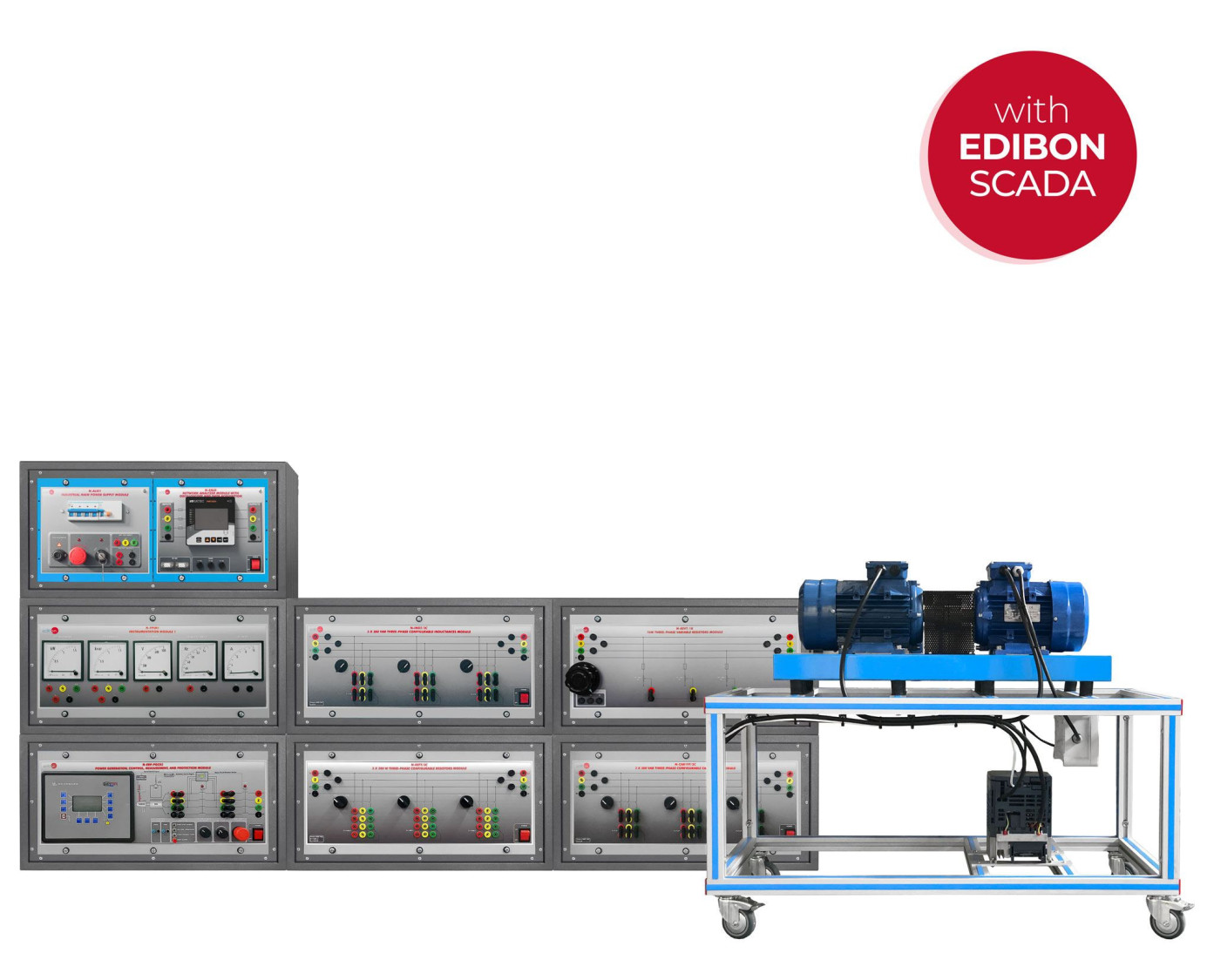 To acquire more experience in the study of wind turbines with three-phase squirrel cage generators, it is recommended to acquire the modules of resistors and inductances oriented to the study of the island operation of the three-phase induction generator and the manual compensation of the reactive power consumed by it. In addition, the analog instrumentation module for the measurement of the most relevant electrical parameters of the generator (P, Q, V, f) is also recommended.